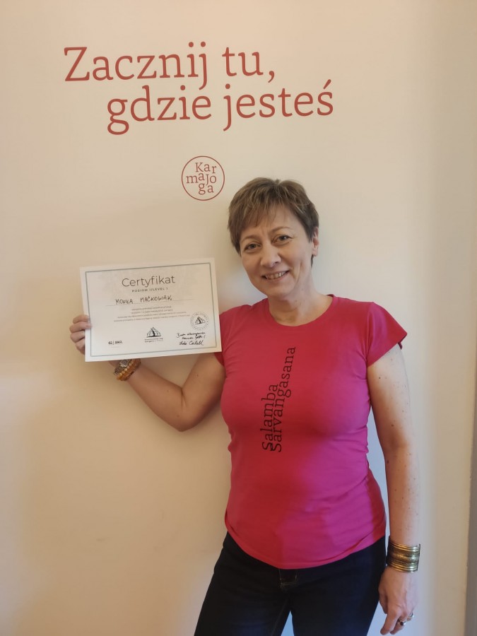 To, że zdecydowałam się przystąpić do certyfikacji wcale nie było dla mnie takie oczywiste. Po pierwsze mój wiek, było nie było, stuknęła mi w zeszłym roku 50-ka. Po drugie brałam udział w kursie nauczycielskim, w trakcie którego dowiedzieliśmy się o zmianach płynących z Puny. Nie ukrywam, że mnie to nieco zdenerwowało- jak to? w trakcie procesu, jakiegoś ustalonego rytmu działań, konkretnych założeń co do sposobu weryfikacji, czyli egzaminu, nagle mam "się przestawić"? Przetrawiłam to w sobie, co ważne "nie obrażając się" na rzeczywistość i spojrzałam na to z innej strony. Zadałam sobie kilka pytań: Po co mi to? Dlaczego mnie ta zmiana aż tak ma wytrącać z równowagi? Przecież praktykując jogę, wciąż jestem w procesie. Okazało się, że właśnie uzmysłowienie sobie, że joga jest dla mnie drogą zmian, że mam potrzebę "aktualizacji" siebie na macie - w praktyce własnej, w kontakcie z drugim człowiekiem - uczenie, w refleksjach nad podążaniem za tym, co głęboko zmienia się w mentalności - spojrzenie filozoficzne (bo nie ośmieliłabym się nazwać tego, co robię, rozważaniem filozoficznym, bo za mały jest jeszcze poziom mojej wiedzy), to wszystko przekonało mnie, że chcę do certyfikacji przystąpić, jakkolwiek by ona nie wyglądała. Niemały w tym udział mieli moi nauczyciele (Roman Grzeszykowski i Aleksandra Duda), z którymi (również, gdy oficjalnie ukończyłam kurs nauczycielski) pozostałam w kontakcie mentor - uczeń. Oni mnie obserwowali, doradzali, ja ich uważnie słuchałam. I tak doszło do tego, że stanęłam przed podjęciem decyzji, że chcę sprawdzić, zweryfikować zarówno ich punkt widzenia, jak i to, co czułam, że we mnie dojrzało. Wewnętrznie poczułam, że mam silną potrzebę domknięcia furtki, żeby, taką miałam nadzieję, ale i przekonanie, otworzyć bramę prowadzącą na kolejną drogę. Może to wszystko brzmi górnolotnie, ale tak właśnie czułam i teraz wiem, że to było dla mnie dobre.